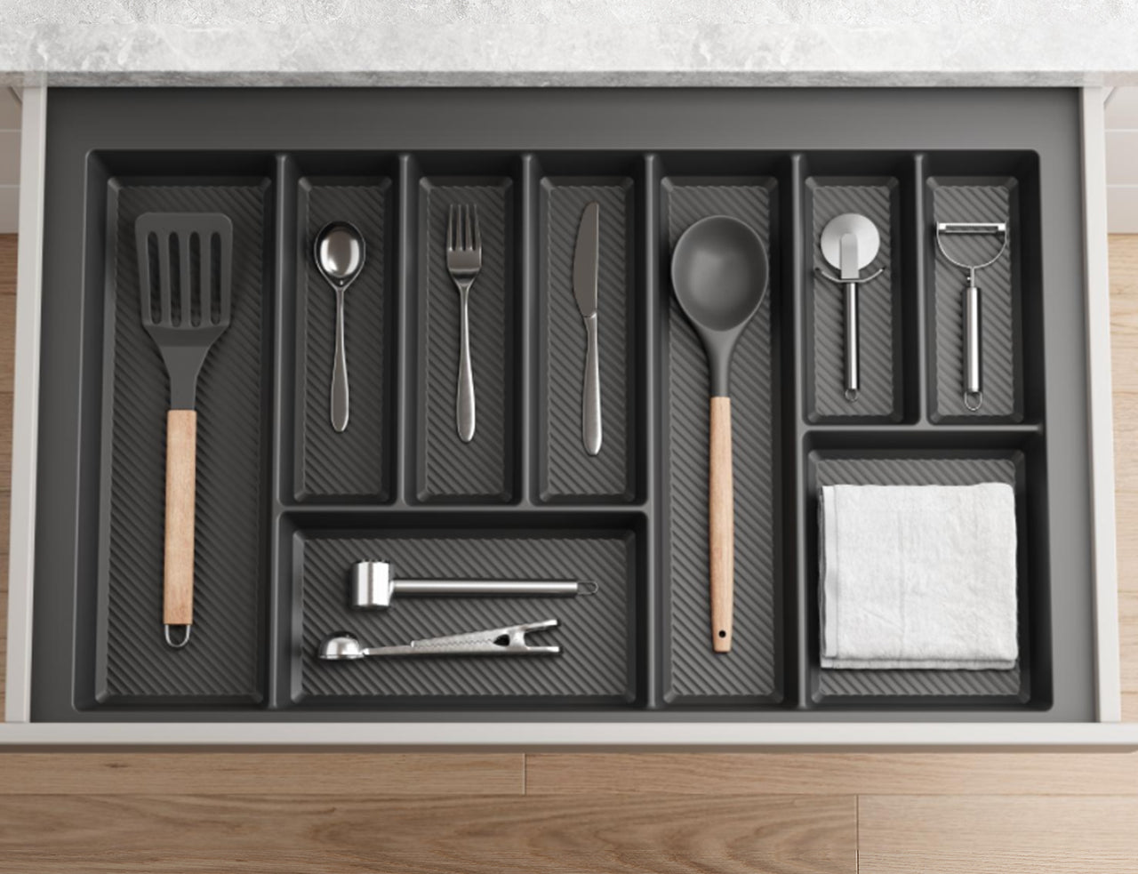 Elevate everyday organisation with the stylish Tramezzo cutlery tray.