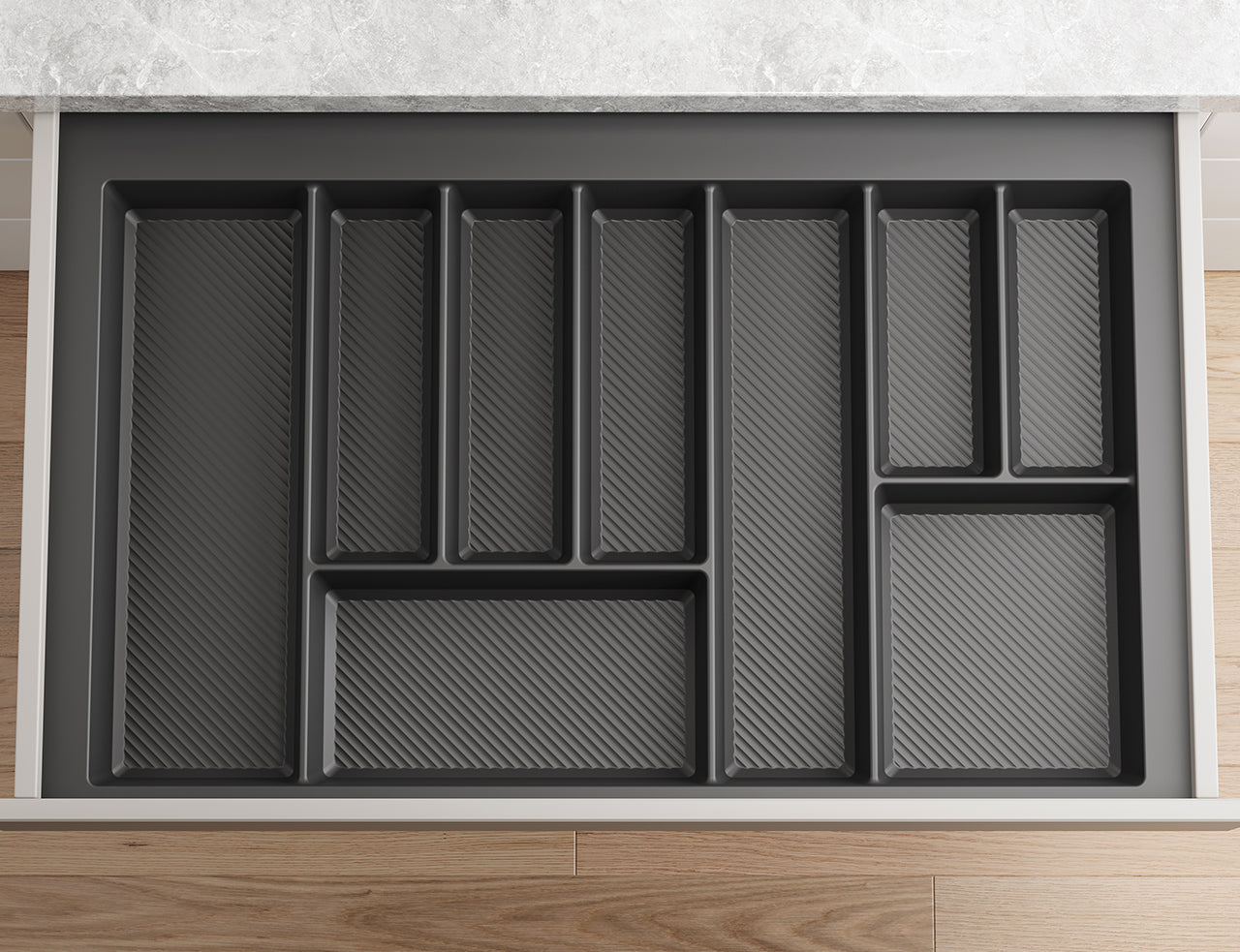 This premium cutlery tray is injection moulded from durable, food-safe polypropylene and designed to fit 450mm and 800mm drawers. It features a modern soft-touch finish, non-slip sound-dampened compartments, and built-in guides for easy width adjustment.